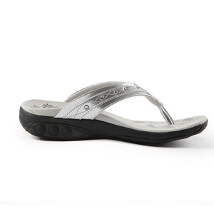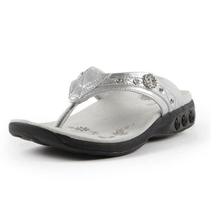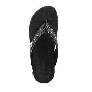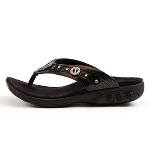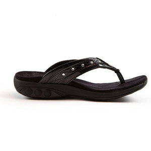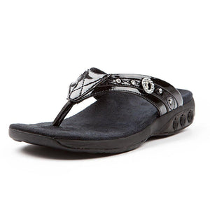 Therafit’s Brittany brings jeweled embellishments to the classic vegan patent leather sandal. The diverse styling makes the Brittany great for any summer activity, as well as for evening wear. Featuring Therafit’s shock absorbing midsoles, contoured footbed with superior arch support, and deep heel-cups that stabilize and support your foot. Vegan friendly. Bring elegant styling to your everyday sandal with the Brittany!